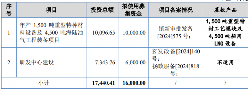 本次IPO长江能科计划募集资金1.6亿元,将全部用于“年产1,500吨重型特种材料设备及4,500吨海陆油气工程装备项目”及“研发中心建设”项目建设。