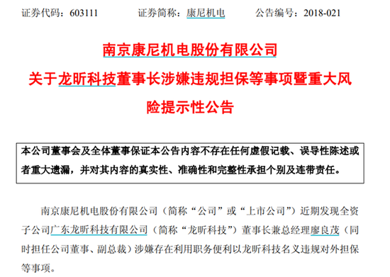 回顾2017年3月,康尼机电以发行股票及支付现金的方式,斥资34亿元溢价收购了净资产仅有8.97亿元的广东龙昕科技有限公司(以下简称“广东龙昕”)100%的股权。然而在2018年6月,康尼机电发布公告称发现广东龙昕董事长兼总经理廖良茂存在违规对外担保行为,导致广东龙昕3.13亿元资金被限制使用。
