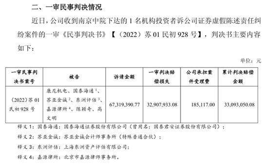 从整体判决结果来看,17起案件一审共判令康尼机电负担赔偿损失及案件受理费合计8,314.65万元。目前,康尼机电已对9名普通投资者履行赔偿义务,合计支付139.48万元;2起案件进入二审程序,6起为待生效一审判决,其中2起机构投资者诉讼拟提起上诉。
