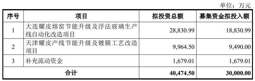耀皮玻璃9月10日披露的2025年度向特定对象发行A股股票募集说明书(修订稿)显示,公司本次向特定对象发行的募集资金总额不超过30,000.00万元(含本数),本次募集资金总额在扣除发行费用后的净额将用于大连耀皮熔窑节能升级及浮法玻璃生产线自动化改造项目、天津耀皮产线节能升级及镀膜工艺改造项目、补充流动资金。