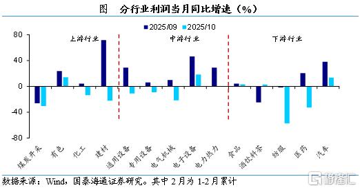 10月规上工业企业利润同比转负,主因量价分化,以及上游涨价传导不均、财务费用增加导致的利润率收窄。行业分化加剧,大部分行业利润增速回落,上 游行 业表现略好于中下游,仅有酒饮料茶行业受益于利润率低基数下的回升而实现利润边际改善。被动补库凸显需求偏弱。下阶段需政策与撬动需求回升,推动补库切换,叠加反内卷深化将助力