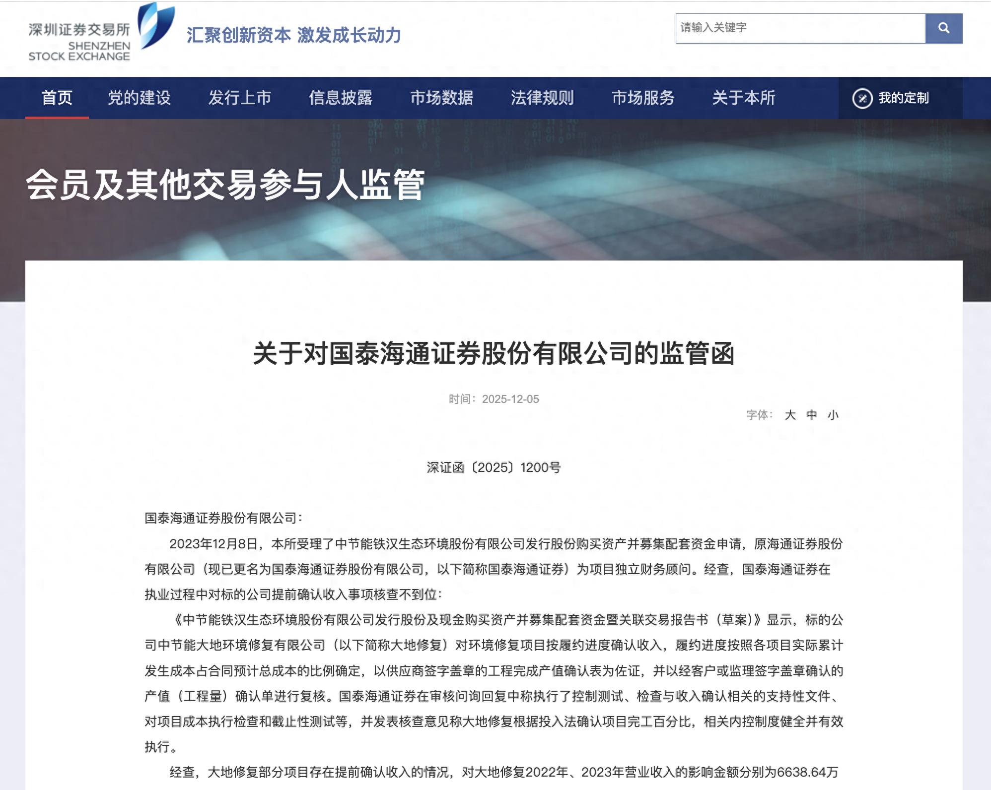 日前,国泰海通收到一份来自深交所的监管函,因涉及项目独立财务顾问,深交所对国泰海通采取书面警示的自律监管措施,两名项目主办人朱凯凯、林子鹏也被通报批评。这已是国泰海通年内二度被罚。