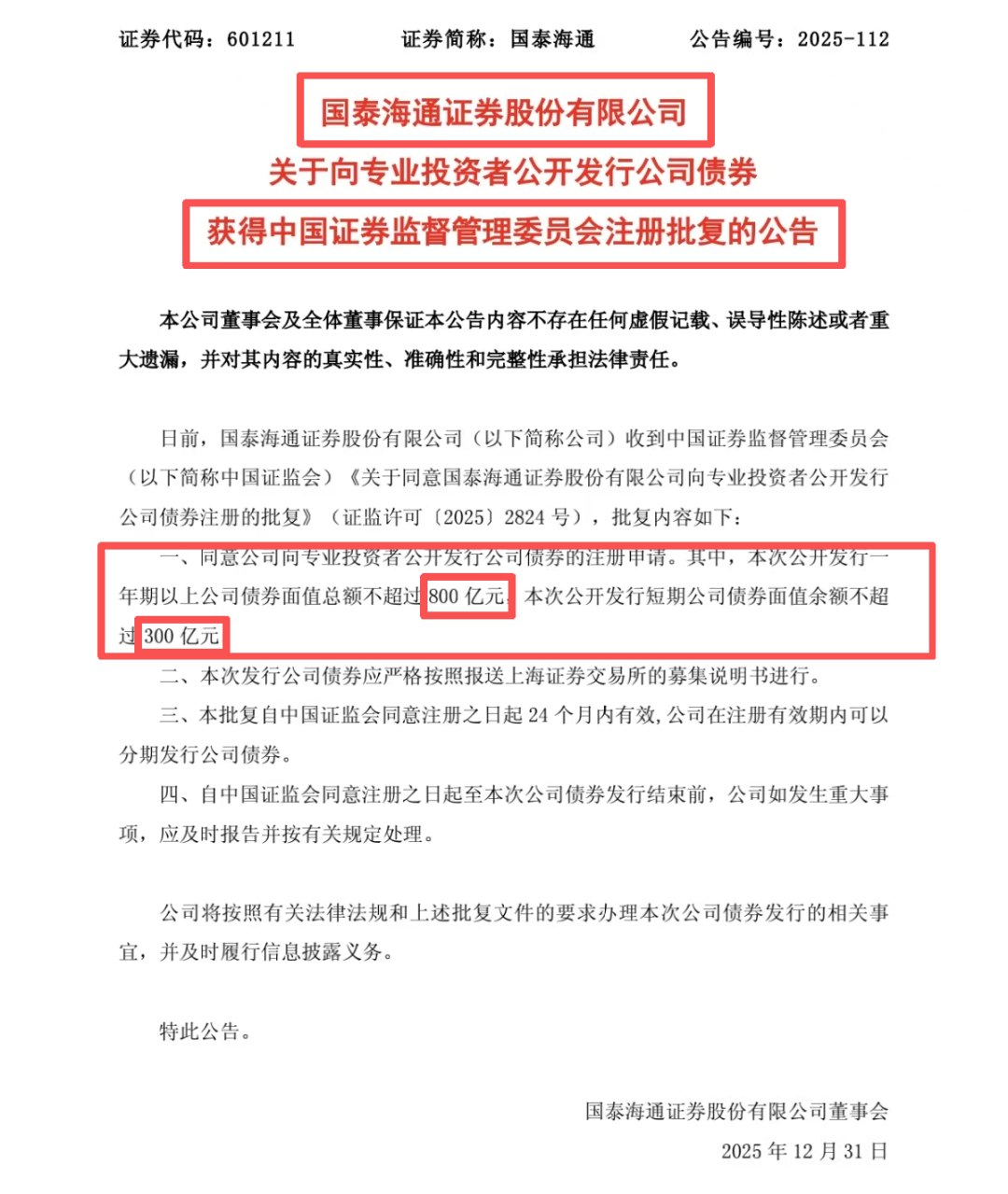 根据国泰海通公告显示,国泰海通1100亿公募公司债获得证监会注册,年内获批的最大单只证券公司公司债。