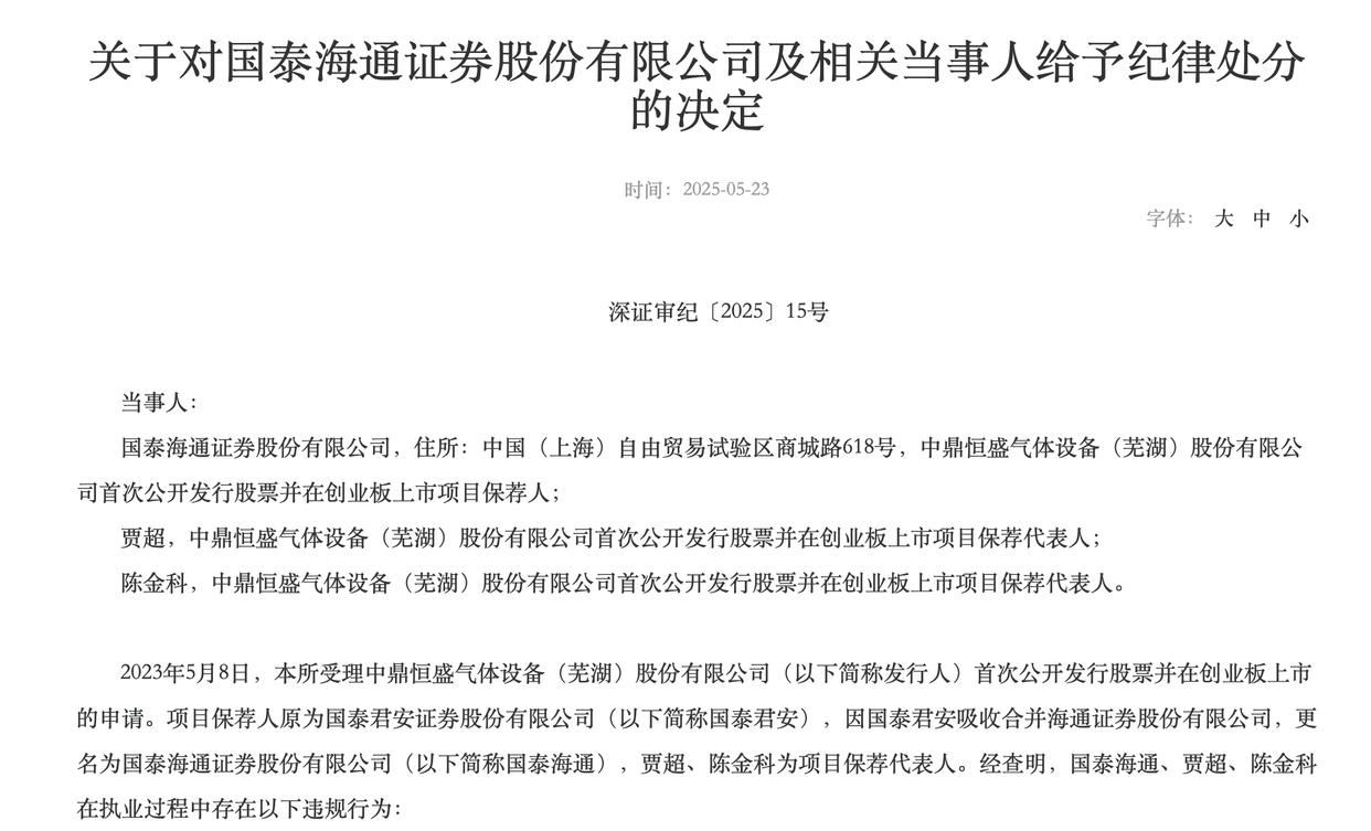 回溯2025年5月,彼时刚刚合并更名不久的国泰海通证券便收到了来自深交所的一纸通告,指出其在中鼎恒盛气体设备(芜湖)股份有限公司IPO项目中的保荐失职。深交所指出,国泰海通在保荐过程中存在“五大核心违规”:未充分关注发行人重大内部控制缺陷、未审慎核查财务信息可靠性、研发费用核查不到位、收入确认核查不充分、资金流水及对赌协议披露核查存漏洞。由于问题严重,涉事的两名保荐代表人被处以“六个月不接受其签字的发行上市申请文件”的顶格处分。
