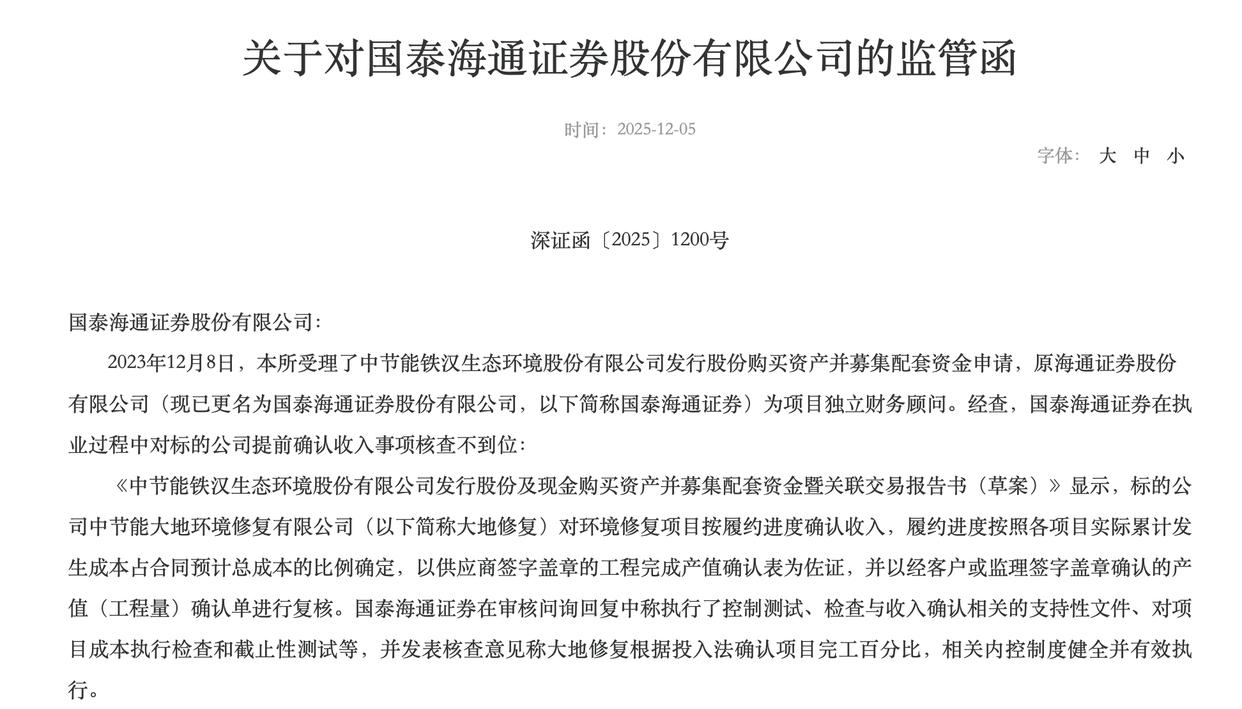 此外,2025年12月,深交所再次向国泰海通出具监管函,涉及节能铁汉(300197)重组项目,在审核问询中,国泰海通曾声称对标的公司的收入确认进行了严格核查,但事后发现,标的公司存在提前两年确认收入的情况,核查工作明显不到位。