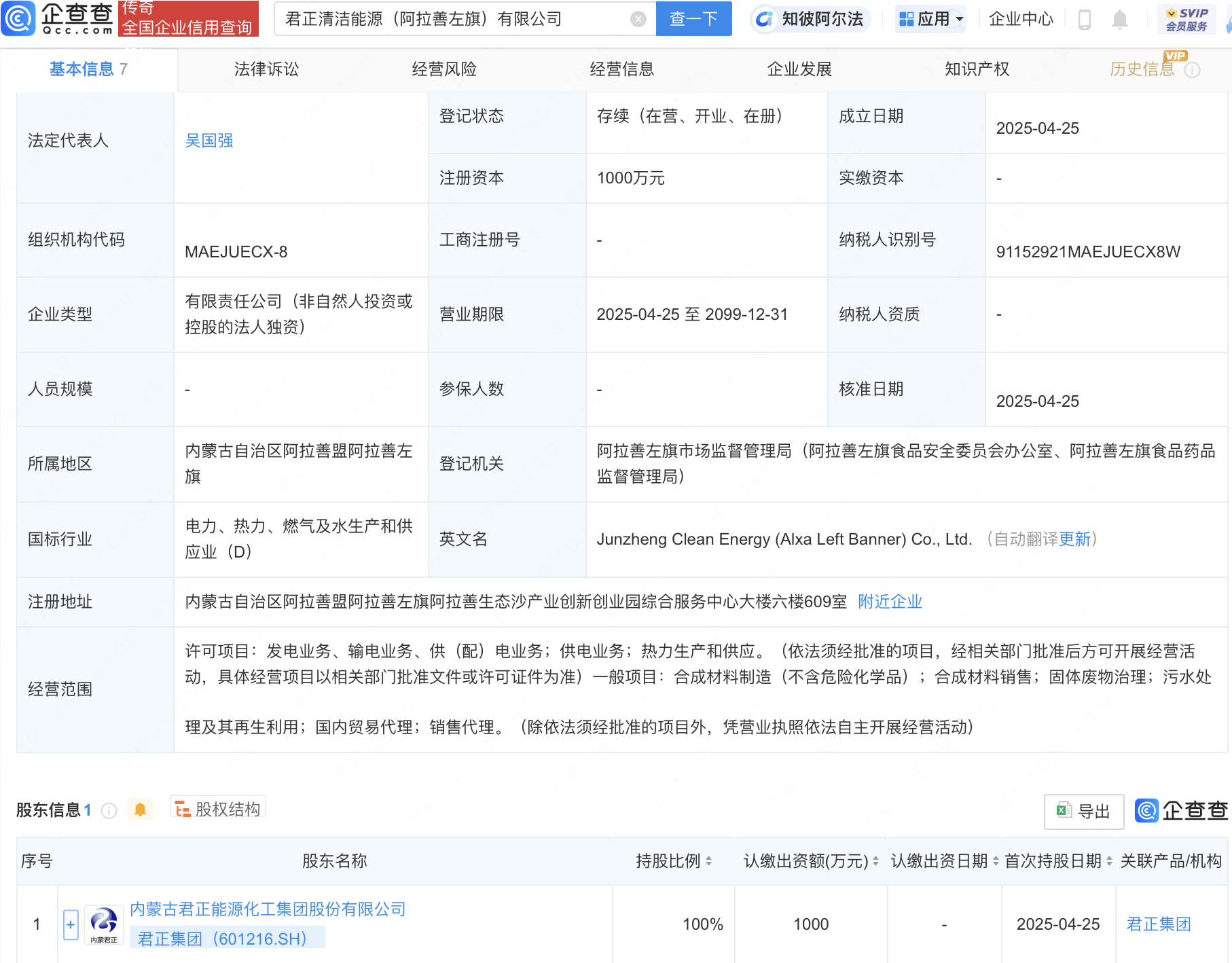 近日,君正清洁能源(阿拉善左旗)有限公司成立,法定代表人为吴国强,注册资本1000万元,经营范围包含:合成材料销售;固体废物治理;污水处理及其再生利用等。企查查股权穿透显示,该公司由君正集团(601216)全资持股。