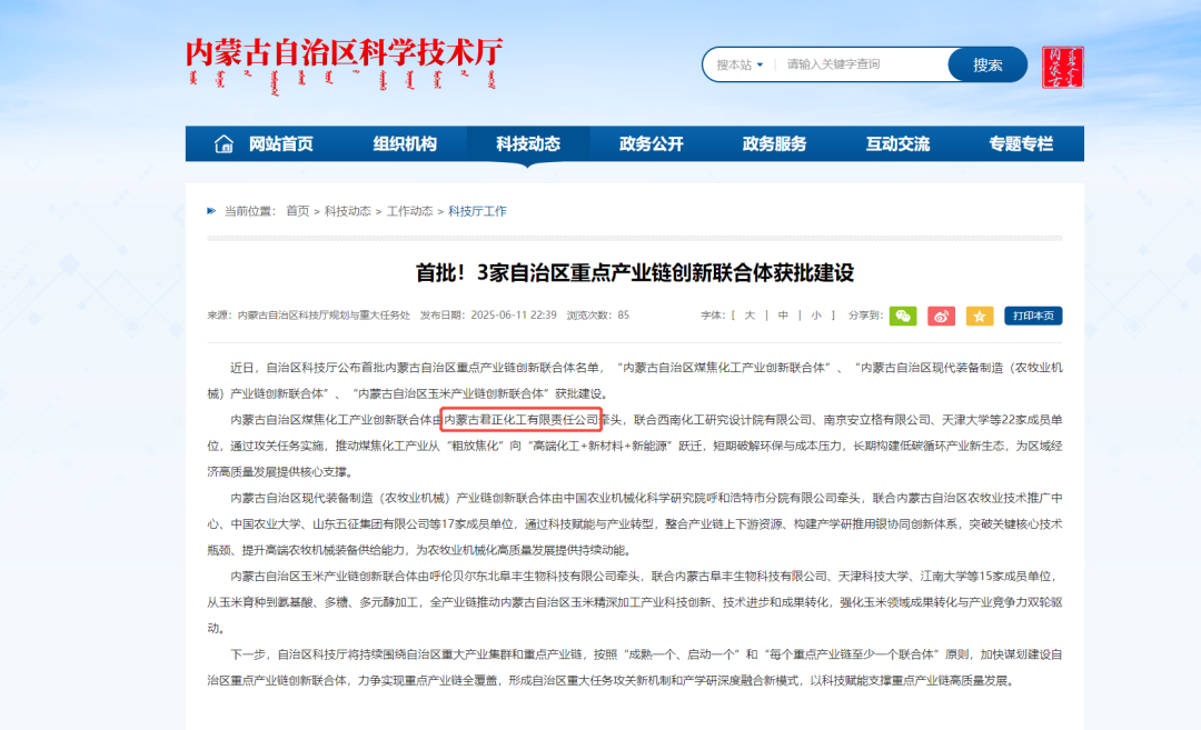 君正集团下属子公司——内蒙古君正化工有限责任公司牵头成立的“内蒙古自治区煤焦化工可降解绿色循环产业链创新联合体”,聚焦煤焦化工行业三大核心痛点展开技术攻关。