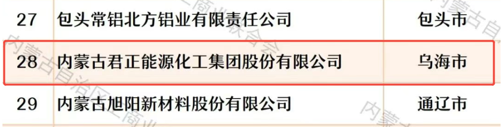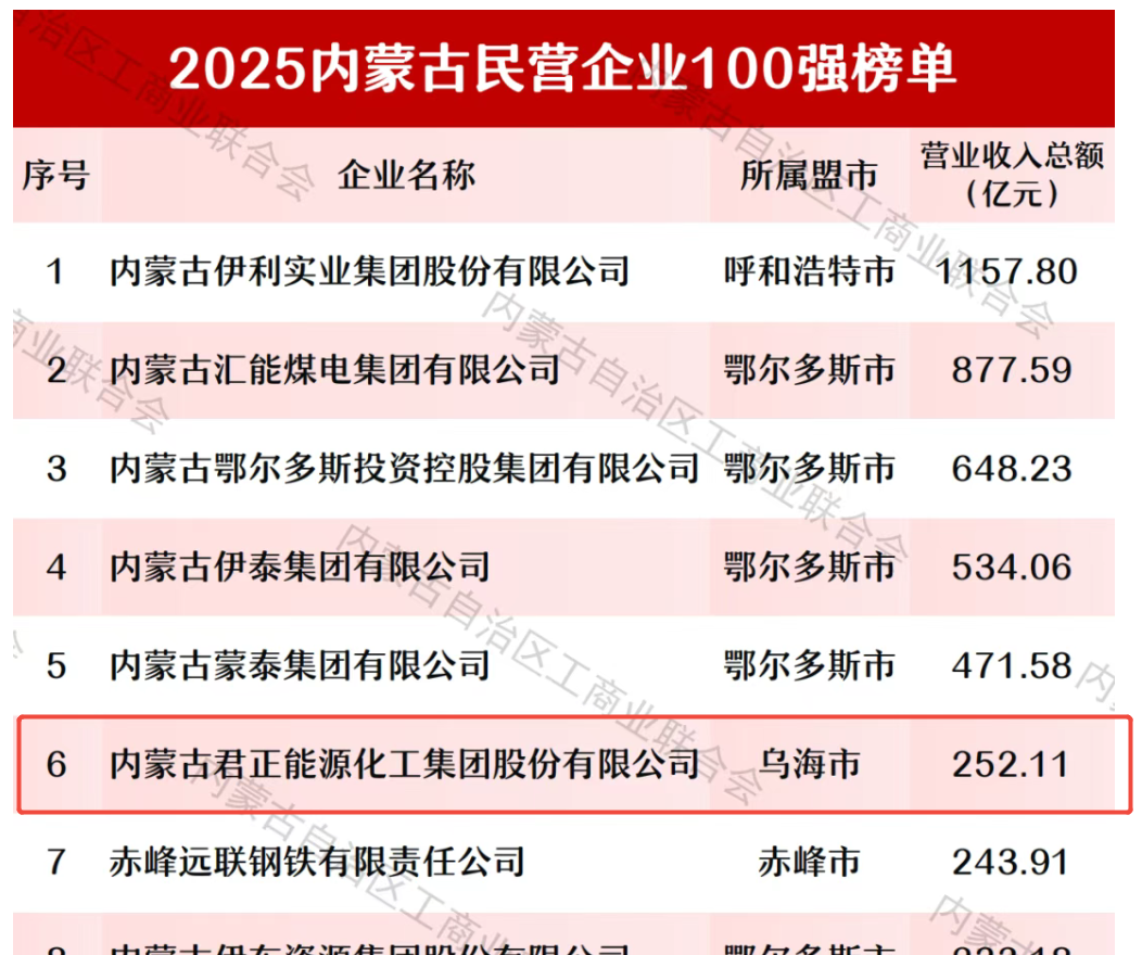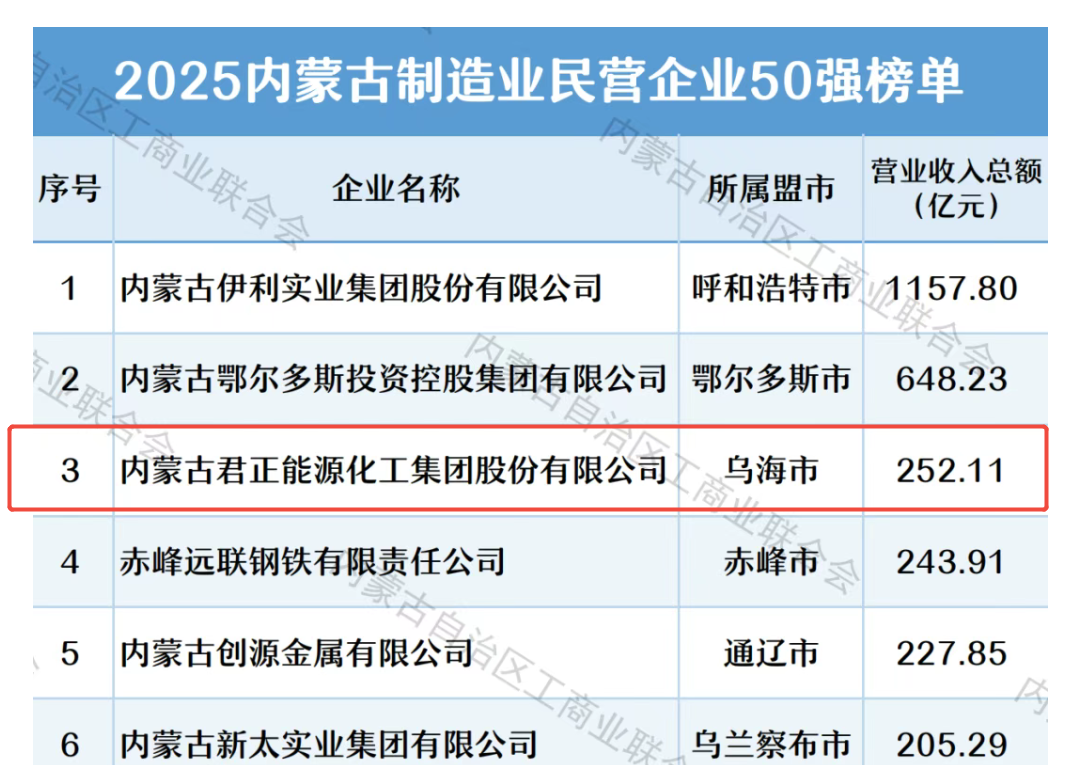 “2025内蒙古制造业民营企业50强”榜单代表着地区制造业的核心竞争力,君正集团登榜第3位,进一步印证了在实体产业中的领先地位。