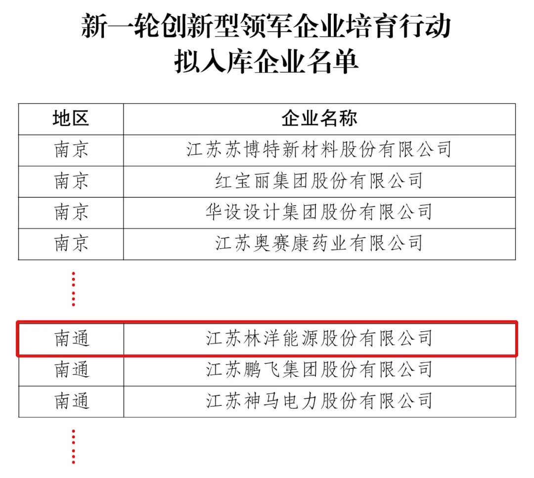 近日,江苏省科学技术厅对新一轮创新型领军企业培育行动拟入库企业名单进行了公示。经自主申报、地方推荐、形式审查、专家评审、信用审查等环节后,江苏林洋能源股份有限公司成功入选,全省共计160家企业。