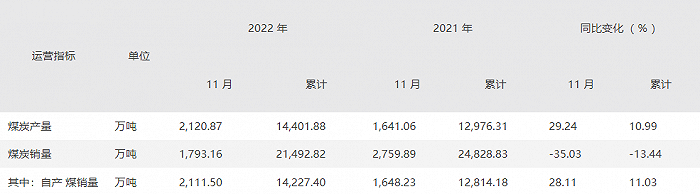 陕西煤业:前11月累计煤炭销量2.15亿吨,同比下降13.44%
