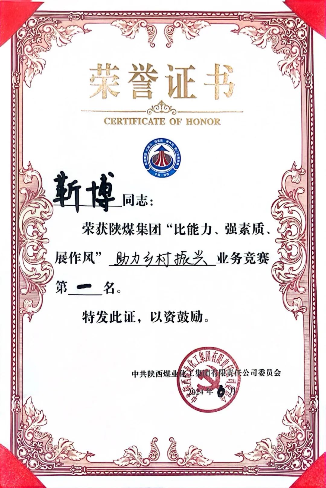 6月25日,陕煤集团举办“强素质、比技能、提效能”助力乡村振兴业务竞赛,陕西煤业选手靳博凭借扎实的专业知识、卓越的实践能力,力压群雄成功夺冠,为公司赢得荣誉。