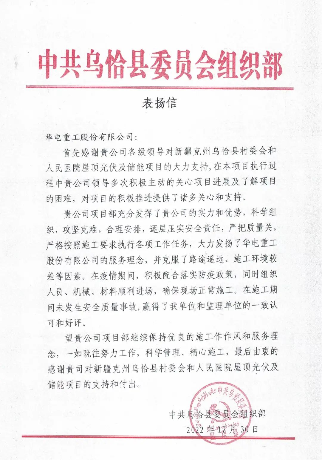 近日,公司收到中共乌恰县委员会组织部发来的表扬信,感谢我司对新疆克州乌恰县村委会和人民医院屋顶光伏及储能项目的支持和付出。