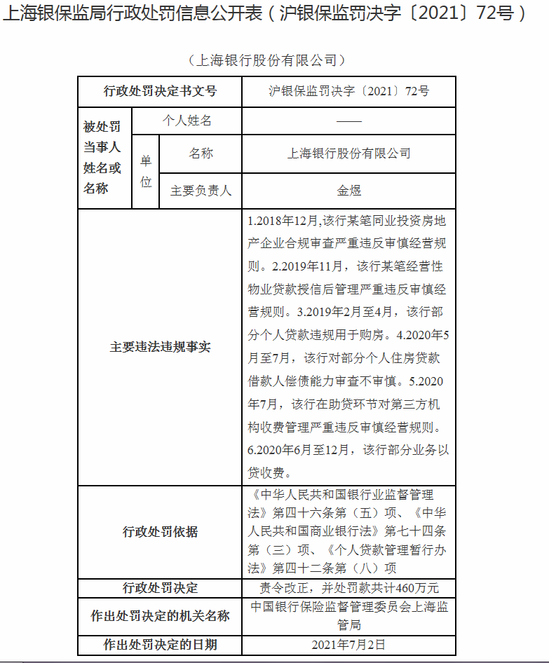 7月12日,上海银保监局公布一则行政处罚。上海银行因六项违规被罚460万。具体违规行为如下:2018年12月,该行某笔同业投资房地产企业合规审查严重违反审慎经营规则;2019年11月,该行某笔经营性物业贷款授信后管理严重违反审慎经营规则;2019年2月至4月,该行部分个人贷款违规用于购房;2020年5月至7月,该行对部分个人住房贷款借款人偿债能力审查不审慎;2020年7月,该行在助贷环节对第三方机构收费管理严重违反审慎经营规则;2020年6月至12月,该行部分业务以贷收费。