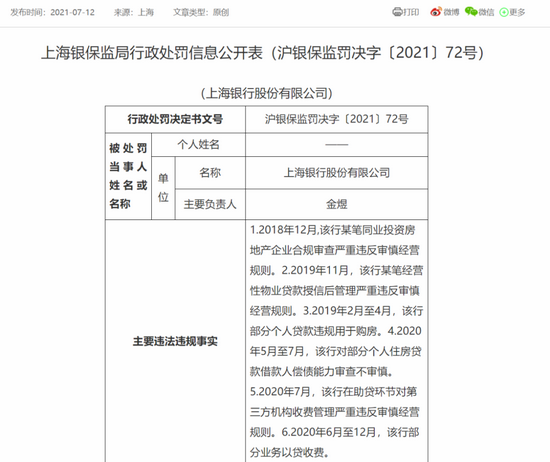 具体来看,上海银行存以下六大违法违规事实:一、2018年12月,该行某笔同业投资房地产企业合规审查严重违反审慎经营规则。二、2019年11月,该行某笔经营性物业贷款授信后管理严重违反审慎经营规则。三、2019年2月至4月,该行部分个人贷款违规用于购房。四、2020年5月至7月,该行对部分个人住房贷款借款人偿债能力审查不审慎。五、2020年7月,该行在助贷环节对第三方机构收费管理严重违反审慎经营规则。六、2020年6月至12月,该行部分业务以贷收费。