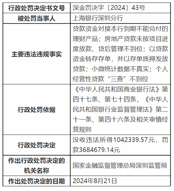 金融监管总局官网信息显示,8月21日,金融监管总局深圳监管局决定对上海银行深圳分行没收违法所得约104.23万元,罚款约368.47万元。主要原因包括:贷款资金对接本行到期不能兑付的理财产品;房地产贷款未按项目进度放款、贷后管理不到位;以贷款资金转存存单,并以存单质押发放贷款;小微统计数据不真实;个人经营性贷款“三查”不到位。