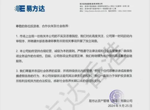 不久,易方达香港对外发了一份声明,称这是不实及恶意指控,公司第一时间启动内审程序并聘请香港律所开展独立调查。还强调说,易方达(香港)严格遵守法律法规和行业监管要求,确保各项业务运作的合规性等。