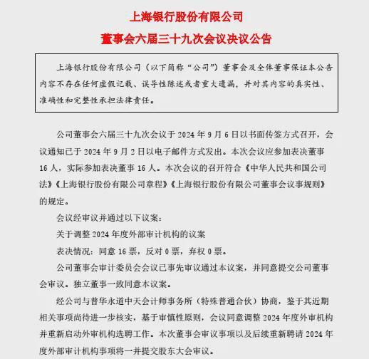 注意!今年9月7日,上海银行曾公告了一份董事会决议,涉及到外审机构普华永道中天会计所。该公告称,“经公司与普华永道中天会计师事务所(特殊普通合伙)协商,鉴于其近期相关事项尚待进一步核实,基于审慎性原则,会议同意调整2024年度外审机构并重新启动外审机构选聘”。
