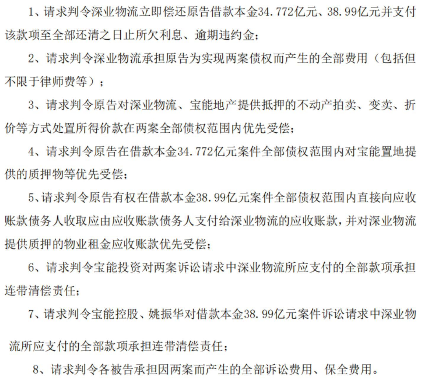 上海银行在公告中提出,请求判令深业物流立即偿还借款本金34.772亿元、38.99亿元并支付该款项至全部还清之日止所欠利息、逾期违约金,以及另外7条诉讼请求。