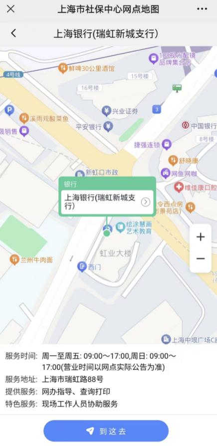 目前,上海银行“社银直联”网点已纳入市社保中心“社保地图”,客户可借助社保电子地图查询上海银行所有社保服务网点信息,包括网点的营业地址、营业时间、服务内容,并可通过社保地图选择网点,点击“到这去”一键导航。