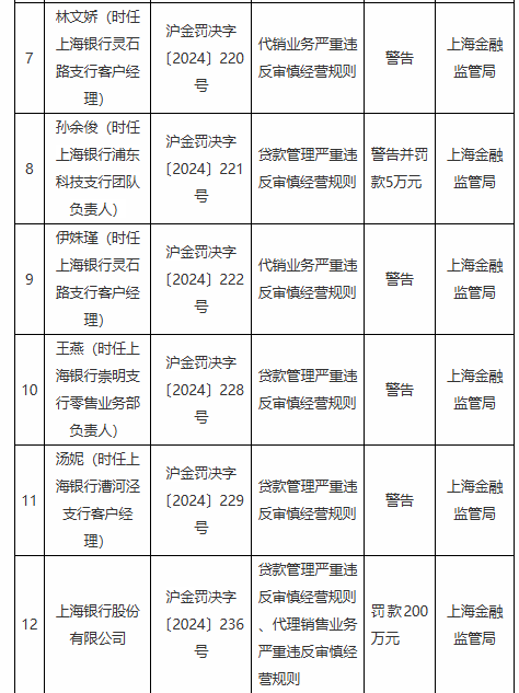 林文娇(时任上海银行灵石路支行客户经理)、伊姝瑾(时任上海银行灵石路支行客户经理)因代理销售业务严重违反审慎经营规则,被警告。