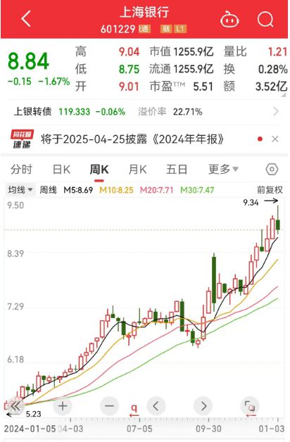 2024年A股收官,银行股年度涨幅榜揭晓。据数据,上海银行复权股价全年涨幅69%,涨幅位居A股上市银行第一。