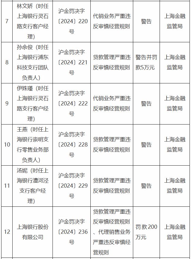 然而,就在上海银行登银行股年度涨幅榜“榜一”后的第一个工作日,1月2日,据上海金融监管局官网消息,上海银行因贷款管理严重违反审慎经营规则、代理销售业务严重违反审慎经营规则,被罚款200万元。此外,包括上海银行浦东科技支行团队负责人等多名支行相关责任人被罚,均涉及贷款管理严重违反审慎经营规则。