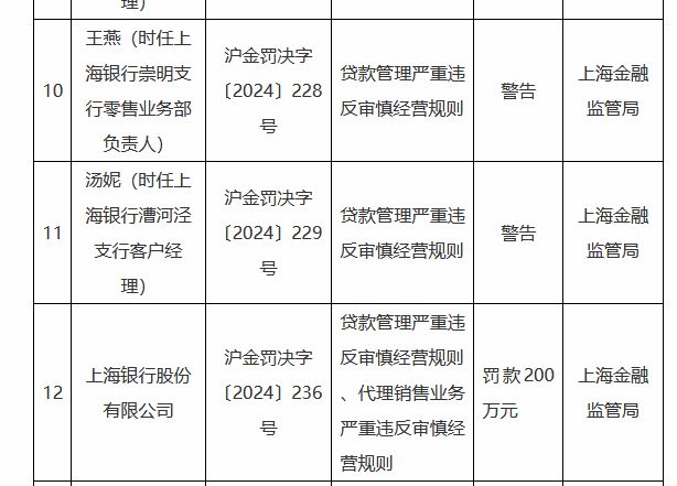 上海银行主体的罚单显示,因贷款管理严重违反审慎经营规则、代理销售业务严重违反审慎经营规则,上海银行被罚款200万元。