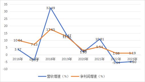 业绩方面,2016年至2023年,上海银行上市的8年时间,公司的营收从增长3.77%变化至下降4.80%,营收增速经历了先增长后下降的趋势,特别是2022年至2023年,上海银行营收连续两年下降。