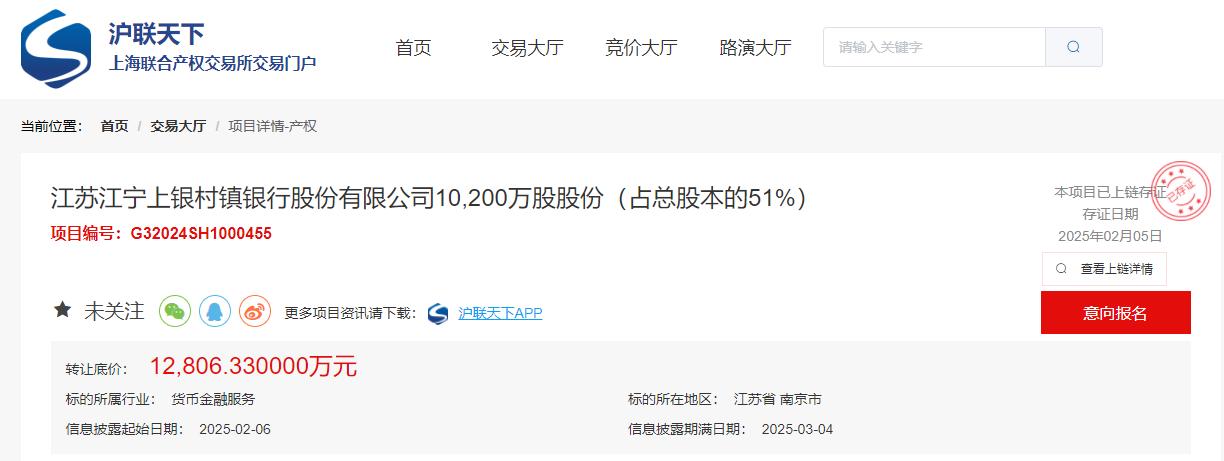 2月5日,上海银行在上海联合产权交易所挂牌转让其持有的江苏江宁上银村镇银行(下称“江宁上银村镇银行”)1.02亿股股份,占总股本比重为51%,转让底价为1.28亿元。此次股权转让成功后,上海银行将不再持有江宁上银村镇银行股权。