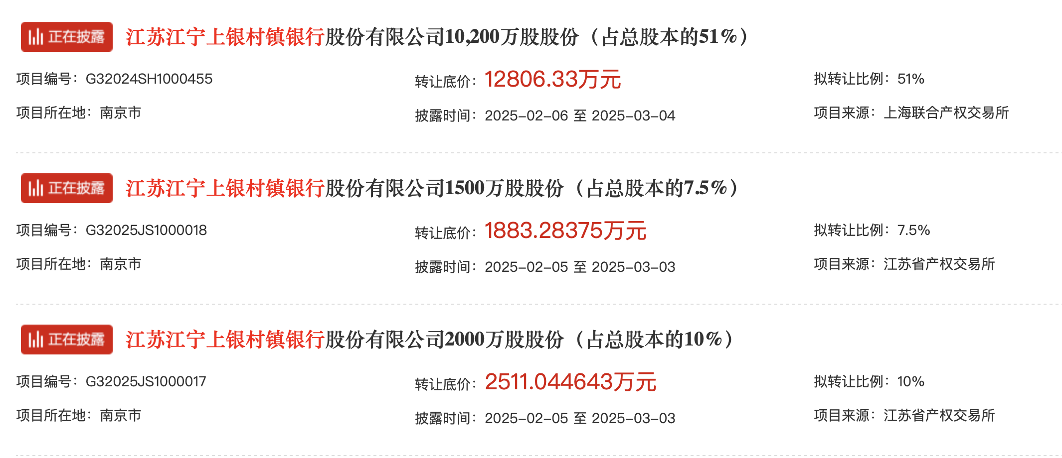 2025年2月6日,上海银行(601229.SH)公开了旗下江苏江宁上银村镇银行的挂牌转让信息。此次共计转让1.02亿股,占总股本比例为51%,也是上海银行持有的全部股份。挂牌转让的信息披露期至3月4日,转让底价约1.28亿元,相当于1.256元/股,保证金为3841.89万元。