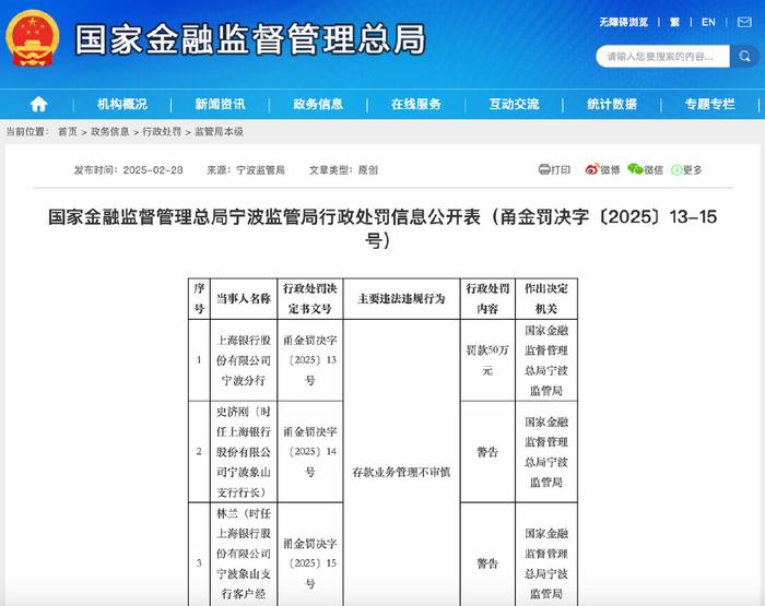 近日,国家金融监督管理总局宁波监管局行政处罚信息公开表显示,上海银行宁波分行,因存款业务管理不审慎,被罚款50万元。