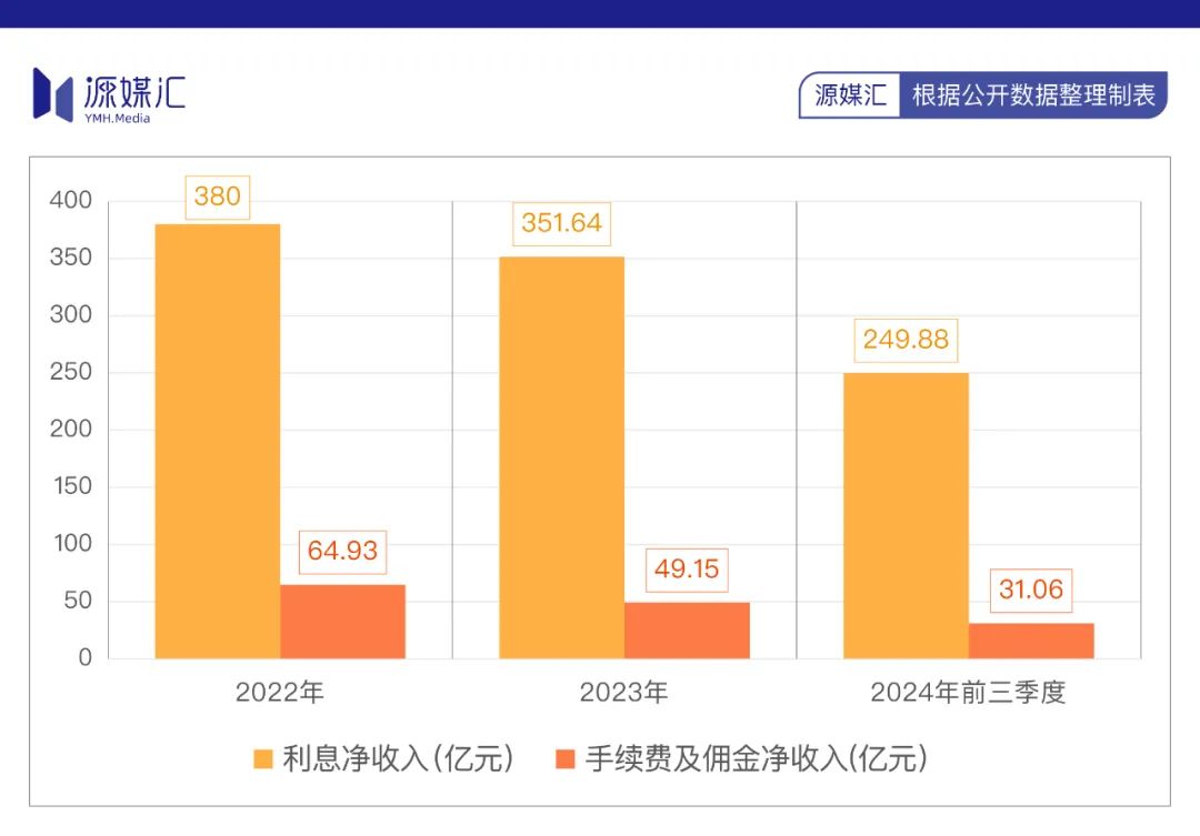 但是,上海银行的利息净收入还在持续下降。2022年、2023年和2024年前三季度分别为380亿元、351.64亿元、249.88亿元;非息收入虽然增长,但是手续费及佣金净收入持续下降,2022年、2023年和2024年前三季度分别为64.93亿元、49.15亿元、31.06亿元。