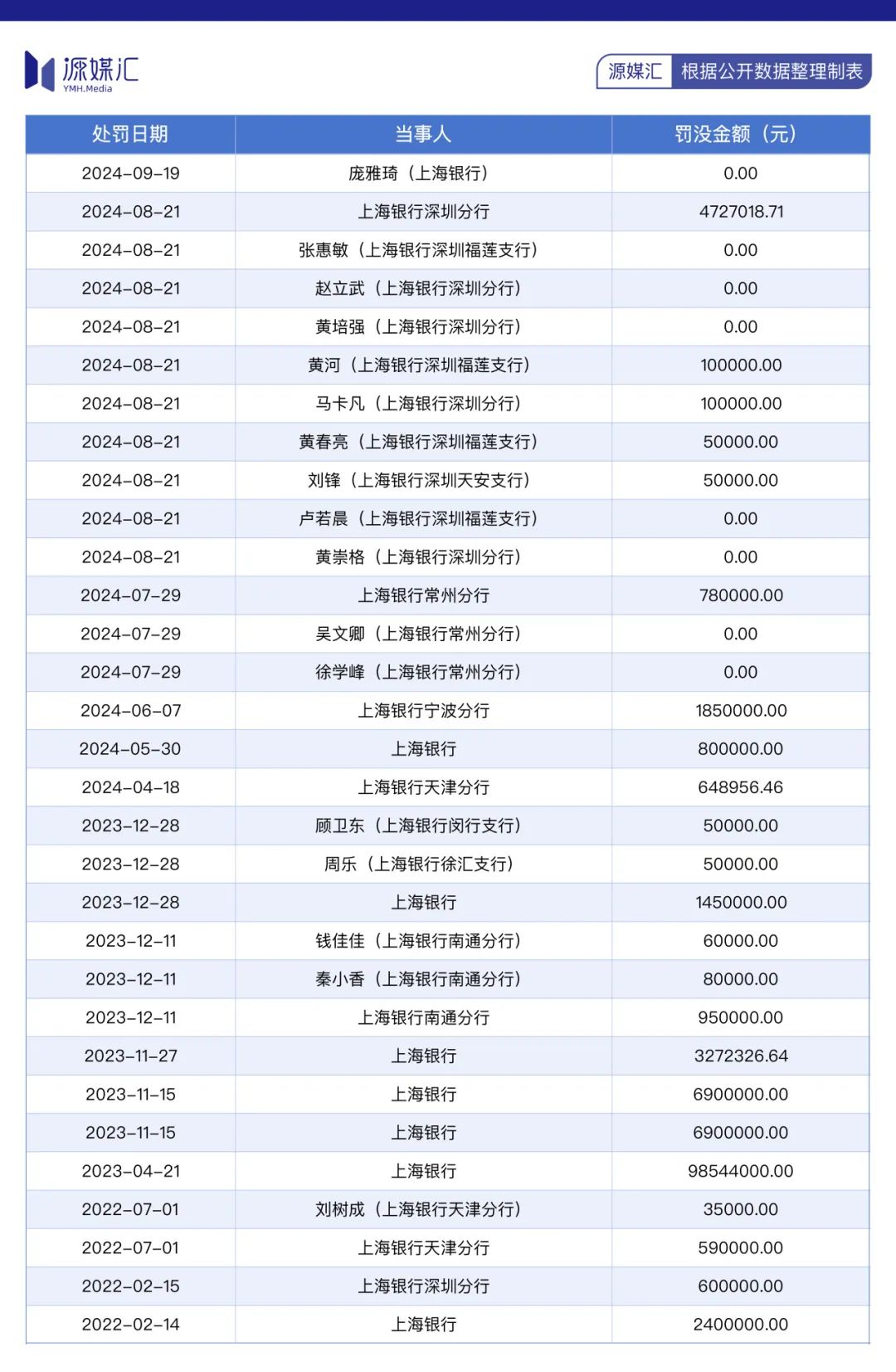 事实上,自2022年以来,3年多的时间里,上海银行及其分支机构、员工累计受到的行政处罚,相关金额已超过1.3亿元。