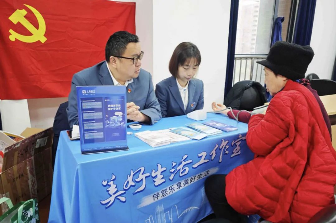 活动现场,上海银行市北分行为社区居民提供血氧血糖检测、反诈知识宣讲等特色服务,工作人员以“金融+健康”的复合视角解答老年群体关切。
