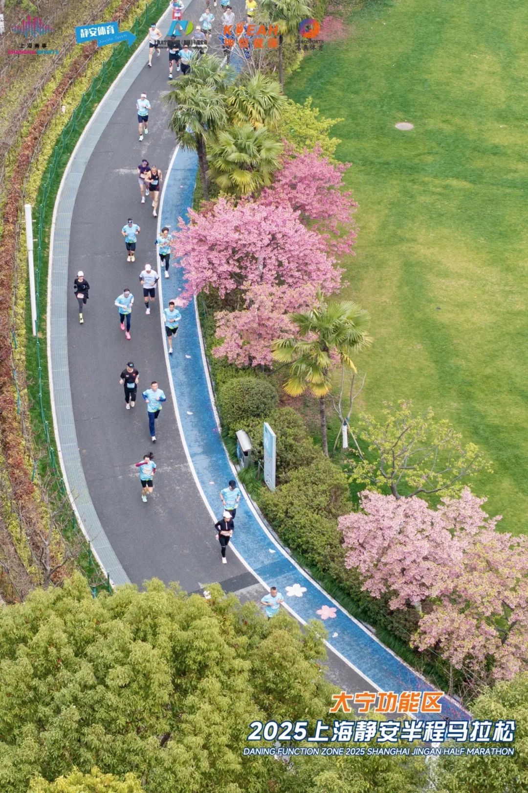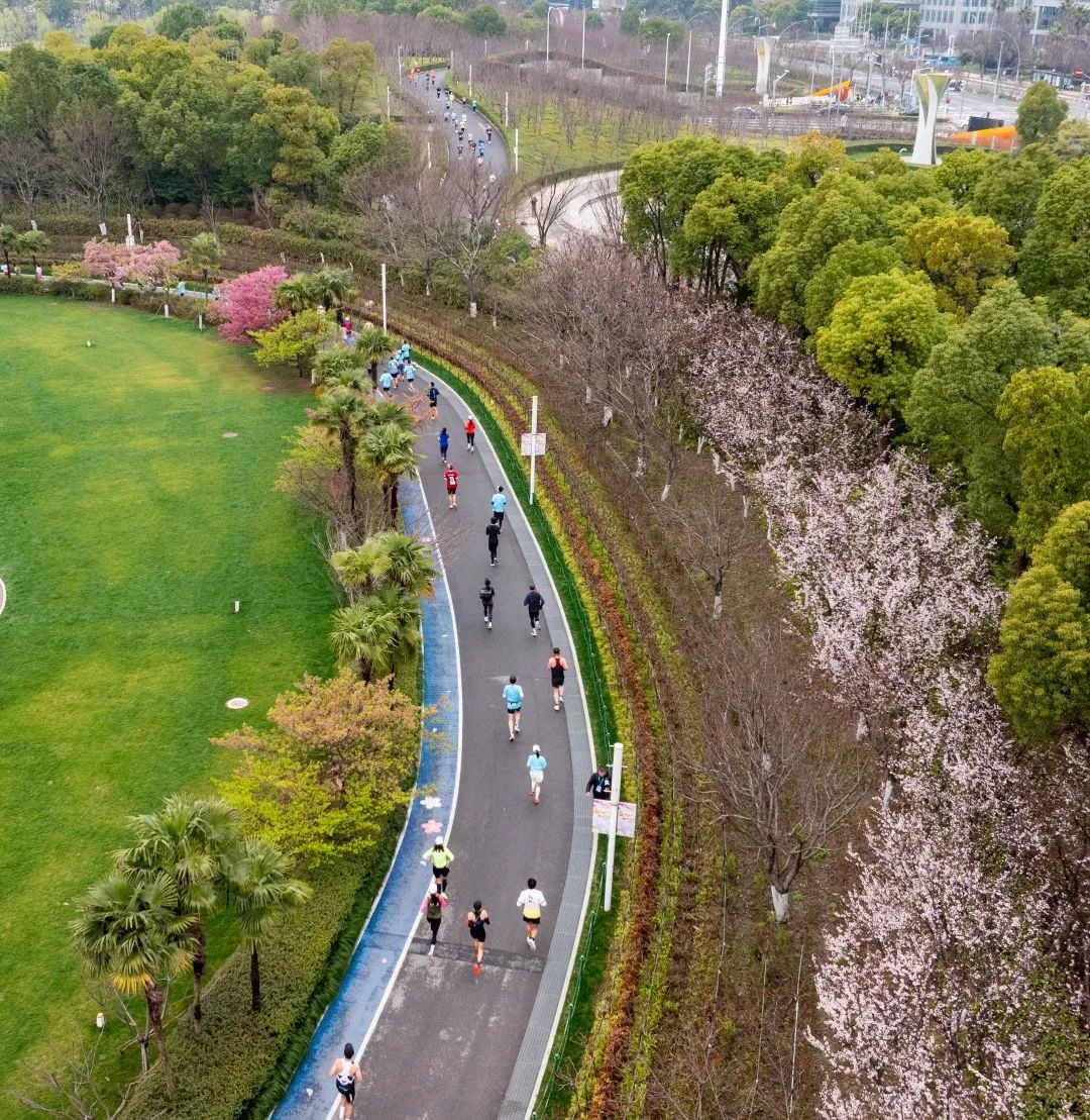 跑道两侧,百万株春花争奇斗艳,玉梅散发暗香,早樱随风起舞,玉兰洁白如雪,郁金香娇艳欲滴,宛如一幅生动的画卷。选手们奔跑其间,既能享受上海中心城区难得的“天然氧吧”,又能感受静安大宁的诗意春光。