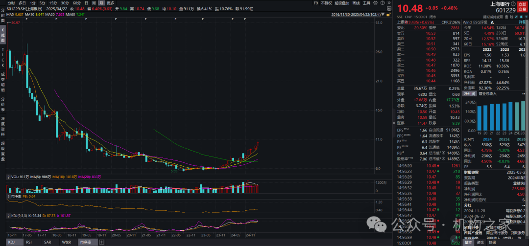 值得一提的是,在金煜领导期间,上海银行完成了A股上市。不过遗憾的是,目前该行股价仍未恢复至当时巅峰时刻。尽管近两年有所反弹,但力度仍不足。上海银行的上市发行价为17.77元/股,而截止4月22日收盘,该行股价仅10.48元/股,仍处于大幅破发状态。
