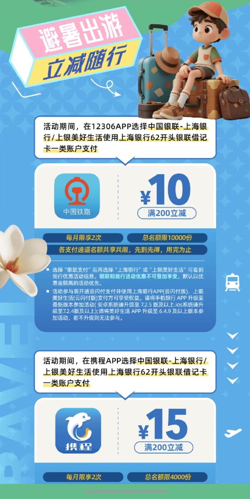 “出行嘉年华”精准对接“促进银发消费行动方案”中“行”场景的适老需求,构建起立体化出行优惠网络。在长途旅行场景,用户通过携程 APP 消费满 200 元即享15元立减,12306购票满200元减10元,两项优惠均支持上海银行银联支付,助力老年群体畅享暑期旅游旺季。