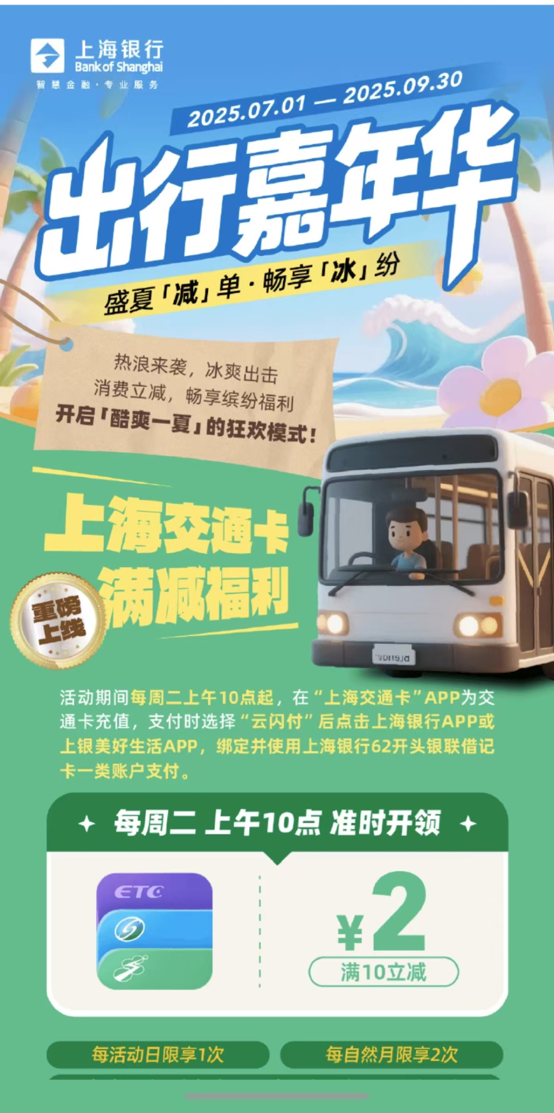 在城市出行场景,则推出滴滴出行 APP 或微信小程序每周五满 30元随机立减2-5元的活动,通过移动支付便利化设计,降低老年人出行成本。值得关注的是,所有出行优惠均延续至9月30日,覆盖整个暑期旅游高峰,用户可通过上海银行 APP 或上银美好生活 APP 便捷参与。