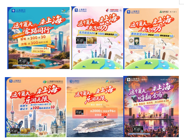 乐游申城。海派文化沉浸深体验,上海银行联合都市旅游卡、KLOOK客路旅行,提供上海之巅上海中心大厦、迪士尼、耀雪冰雪世界、野生动物园等众多旅游景点、IP主题纪念品的信用卡、借记卡消费满减优惠。爱达魔都号是国内首艘自主建造的大型豪华邮轮,上海银行联合爱达邮轮,以信用卡、借记卡满2000享96折最高立减200元的船票礼遇、信用卡满1000港币享96折最高减128港币的船上消费优惠,首发开启“金融+文旅”的海上航程。后续还将推出欢乐谷、玛雅水世界、上海大剧院满减活动,并联合春秋旅游推出暑期线路游,提供全方位优惠,畅游上海、探索城市魅力。