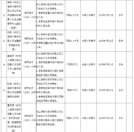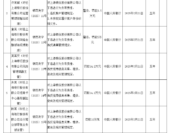 具体来看,许某斌(时任上海银行运营管理部副总经理)因对违反账户管理规定、未按规定履行客户身份识别义务负有责任,被警告并罚款8.5万元;