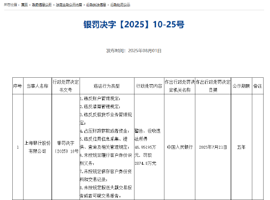 8月1日金融一线消息,中国人民银行行政处罚公示显示,上海银行因存在多项违法行为,被警告,没收违法所得46.95195万元,罚款2874.8万元。罚单涉及违法行为类型如下:1.违反账户管理规定;2.违反清算管理规定;3.违反反假货币业务管理规定;4.占压财政存款或者资金;5.违反信用信息采集、提供、查询及相关管理规定;6.未按规定履行客户身份识别义务;7.未按规定保存客户身份资料和交易记录;8.未按规定报送大额交易报告或者可疑交易报告。