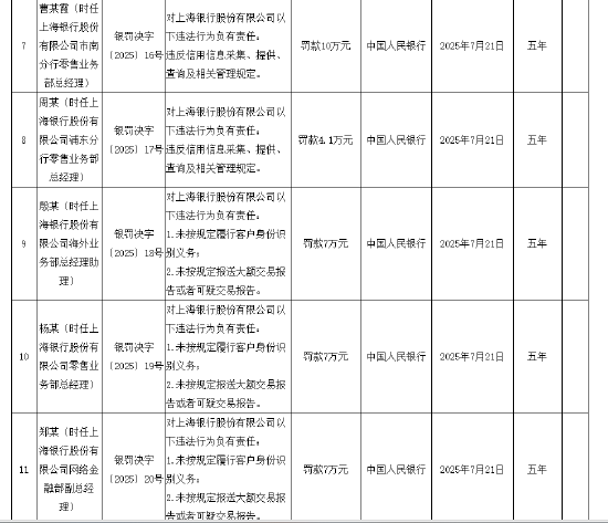 杨某(时任上海银行零售业务部总经理)因对未按规定履行客户身份识别义务、未按规定报送大额交易报告或者可疑交易报告负有责任,被罚款7万元;
