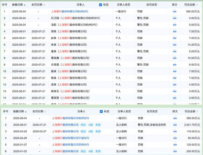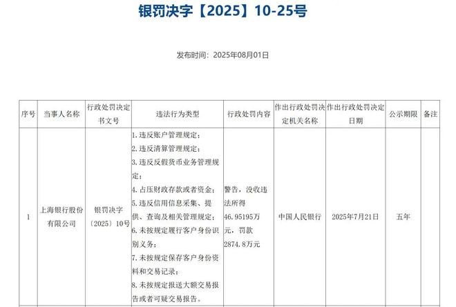就在5天前的8月1日,央行公布的行政处罚显示,上海银行因八项严重违规行为被警告、没收违法所得46.95万元,并处罚款2874.8万元,合计罚没金额超2921万元。15名时任高管同步追责,个人罚款总额达108.5万元。