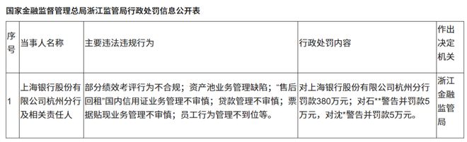 8月4日,上海银行杭州分行因资产池业务管理缺陷等六项违规行为被处以380万元罚款,两名相关责任人被警告并各罚5万元。