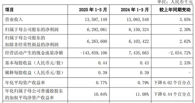 再看业绩,在上海银行2025年稳步上升的一季报数据里,杠杆游戏发现两组“矛盾”的数据:归母净利润63亿元,同比增长2.3%,绝对值依旧漂亮;经营现金流-1439亿元,同比骤降20倍。