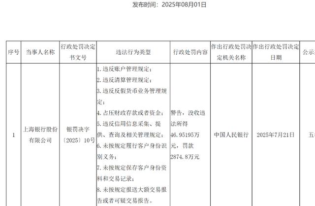 8月1日,中国人民银行披露了行政处罚信息,上海银行因涉及违反账户管理规定、违反清算管理规定、占压财政存款或资金等8项违规行为,被实施警告,并且没收违规所得46.5万元,罚款2874.8万元,合计罚没超2900万元。