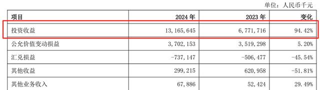 其他非利息净收入中,投资收益达131.66亿元,同比增长94.42%。投资收益占到非息净收入的64%,占到了总收入的24.85%。