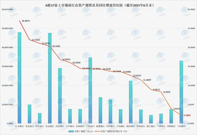 据显示,截至2025年6月末,上海银行以约3.29万亿元的总资产规模,在A股17家上市城商行中位列第四,但是其2.18%的同比增速水平,已让上海银行在这17家上市城商行中处于垫底水平。