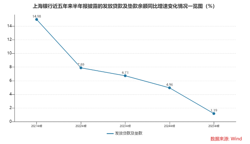 从半年报披露的总资产构成来看,发放贷款和垫款是上海银行占比近半的一类资产,截至2025年6月末,上海银行发放贷款和垫款余额约为1.40万元,同比增长仅为1.19%,扩张极为缓慢。而1.19%这一增速水平已是上海银行近五年来发放贷款和垫款同期的最低增速。