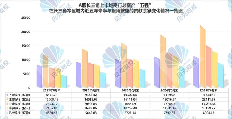 图/新京报贝壳财经记者汇总A股长三角地区上市城商行总资产规模“五强”近五年各期半年报的相关数据制图